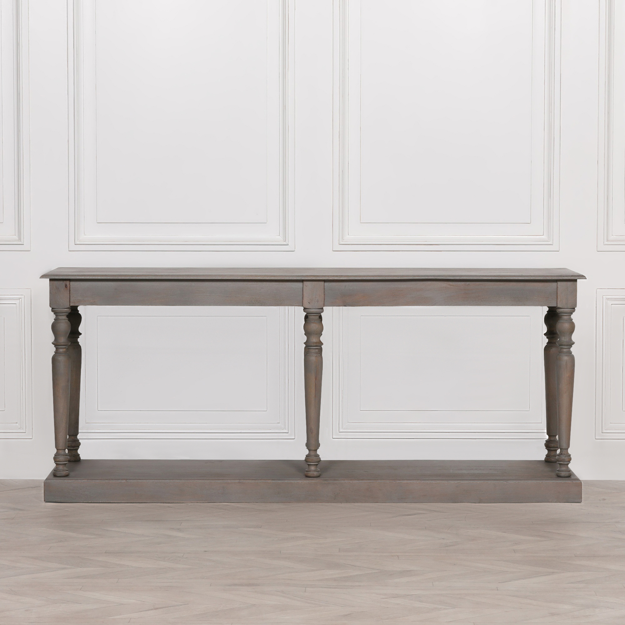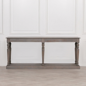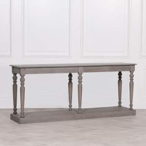 Wooden console in a rustic finish with six columned legs.