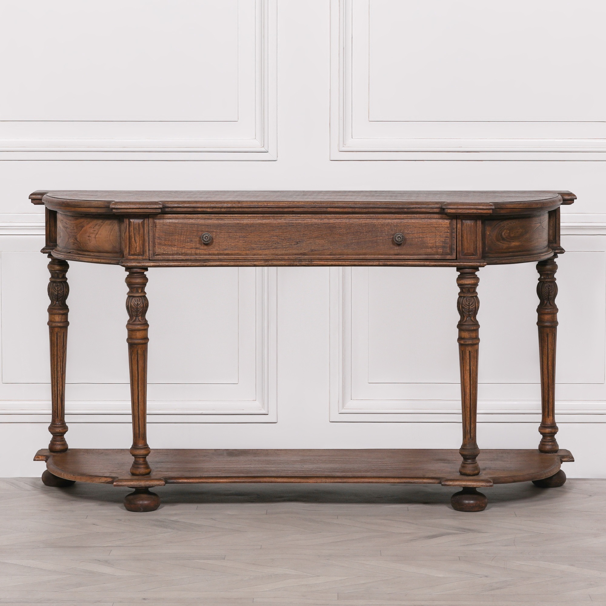 White cedar wooden 151cm console table in a rustic finish with hand-carved column legs and curved edges.