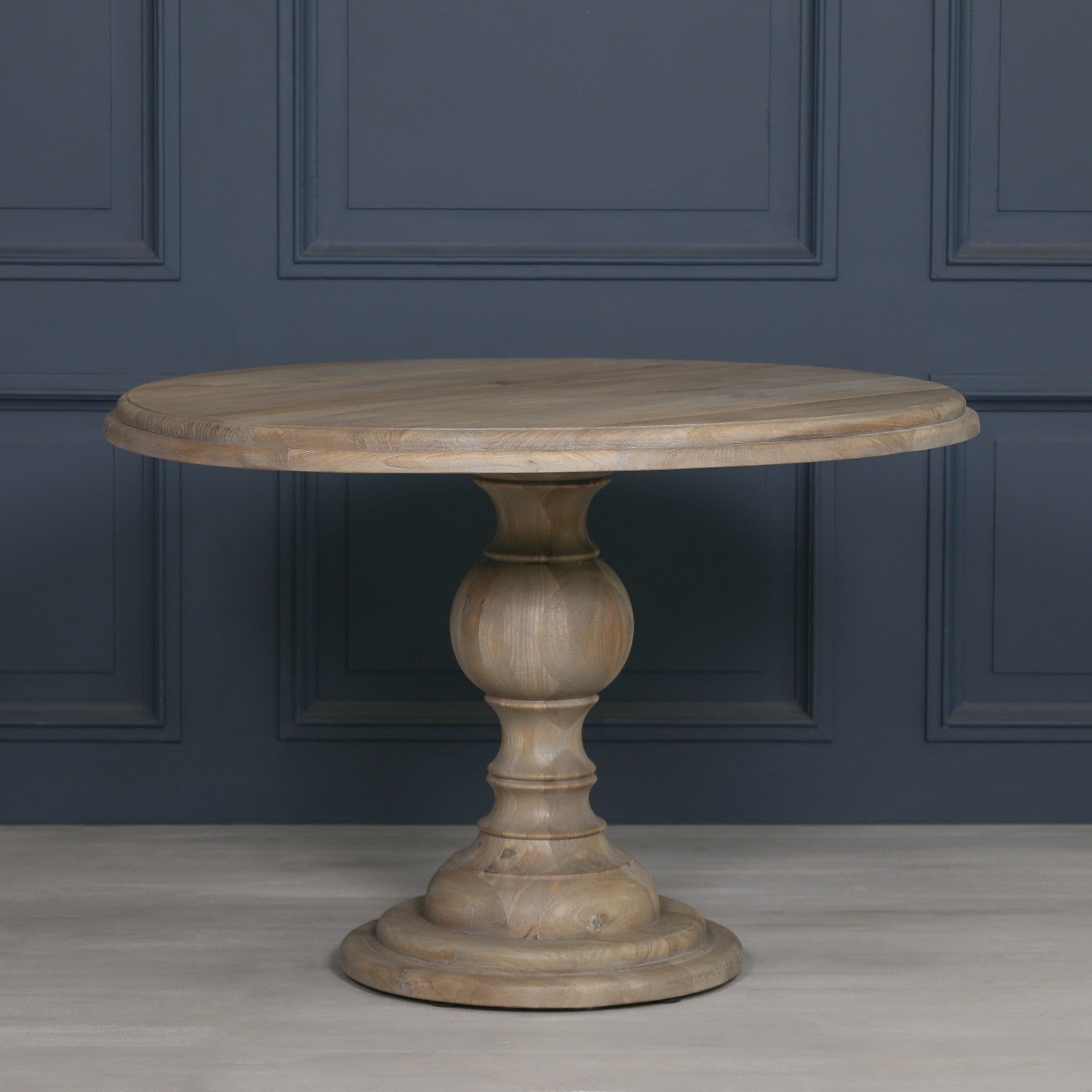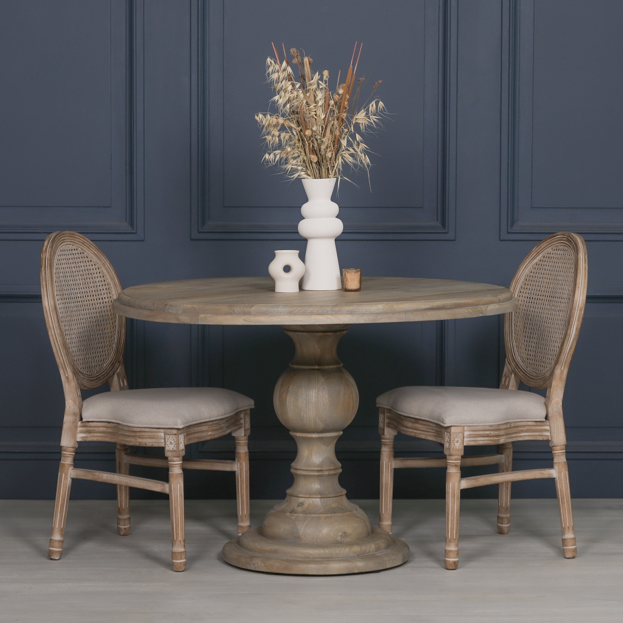 Round 120cm dining table handcrafted from wood in a rustic finish with a hand-carved detailed columned base. Styled with Wooden Louis Upholstered Dining Chairs.