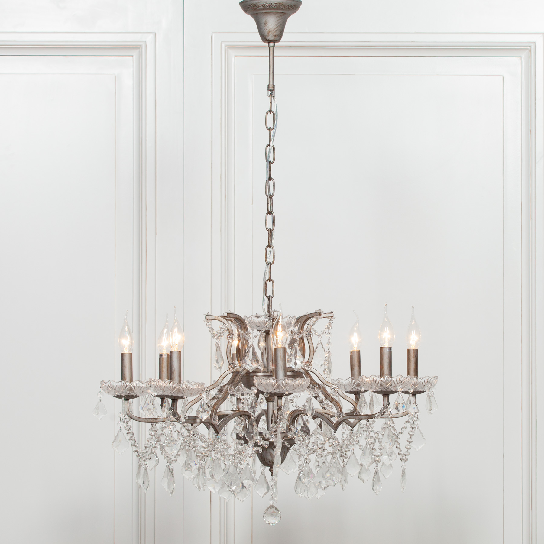 Eight branch French-style shallow chandelier in an antique silver finish metal frame with polished, clear-cut glass droplets and an adjustable chain.