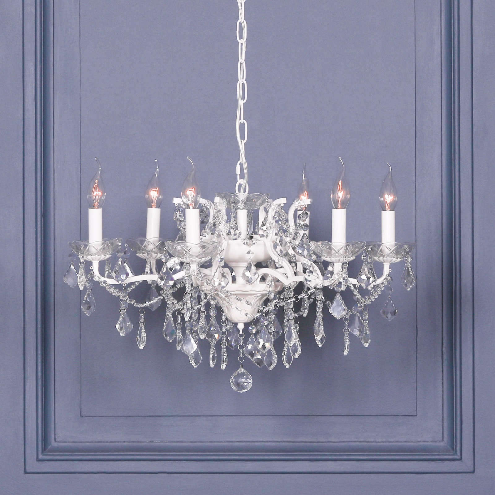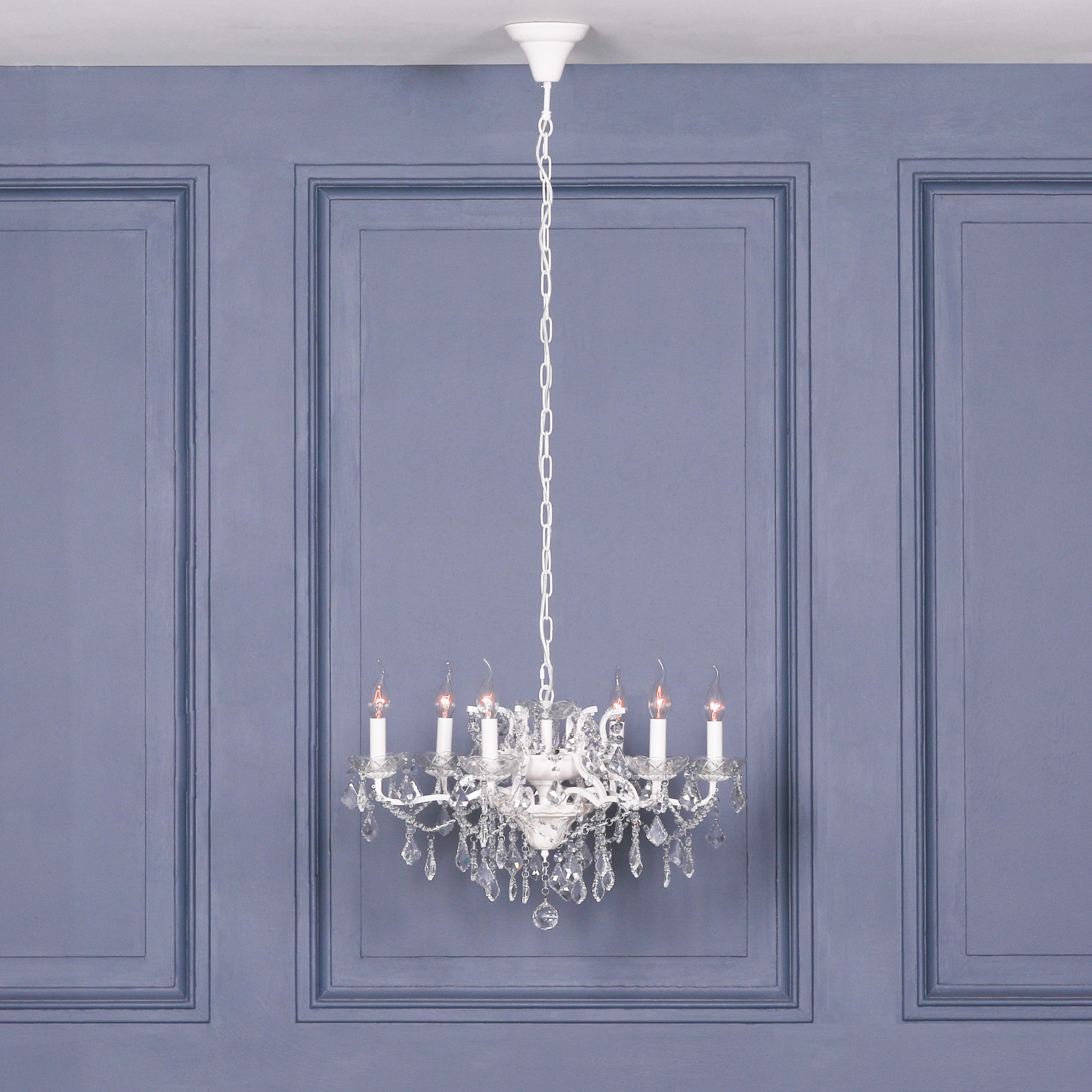 Six branch French-style shallow chandelier in a white finish metal frame with polished, clear-cut glass droplets and an adjustable chain.