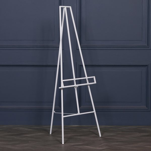 Contemporary style metal easel in a white finish with minimalistic details and an adjustable shelf.