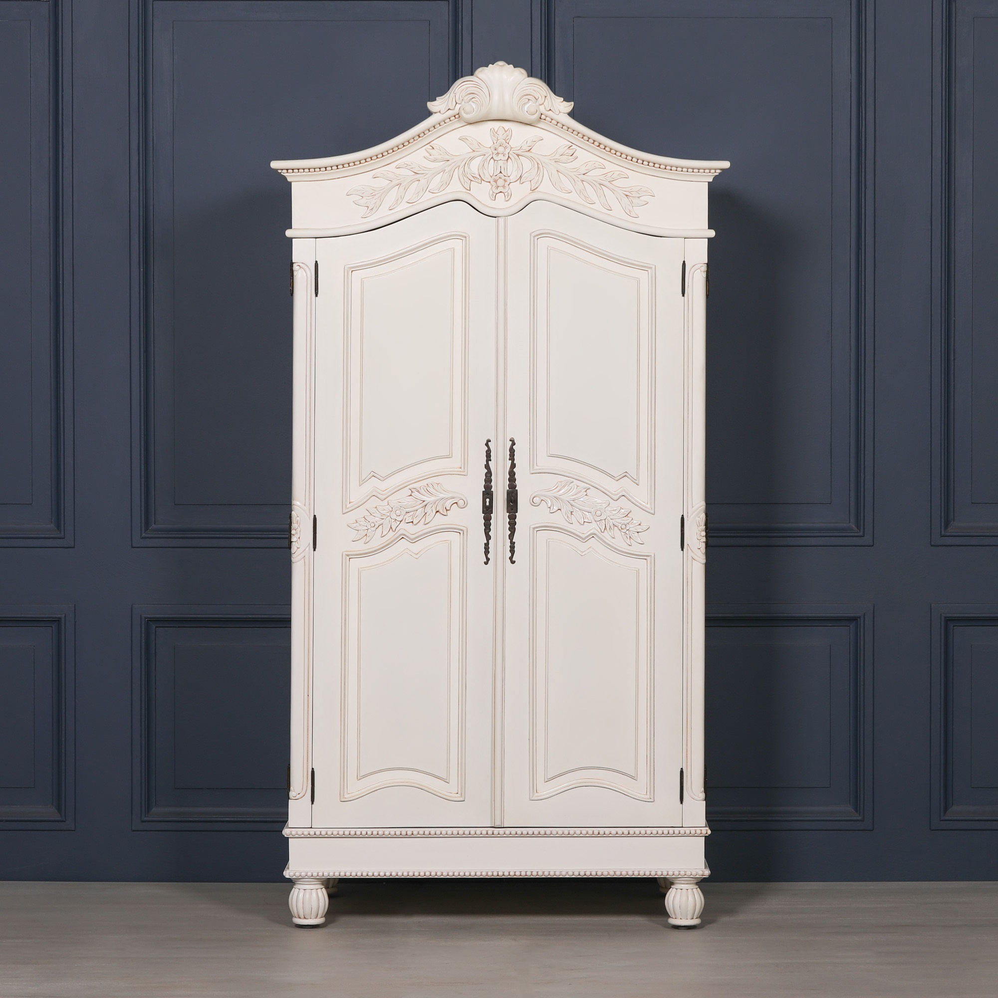 White painted double wardrobe in a French style with intricate wooden hand carved detailing. The internal features includes hanging pole with 2 adjustable and removable shelves.
