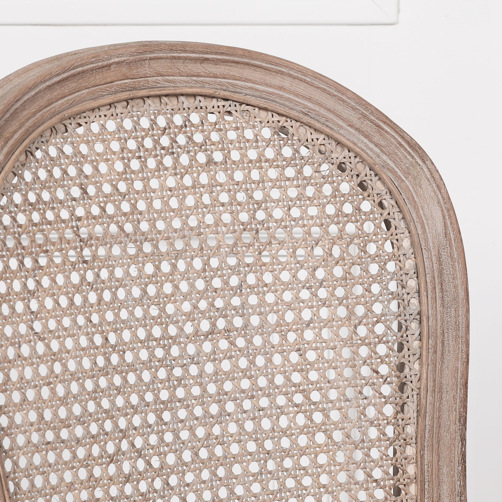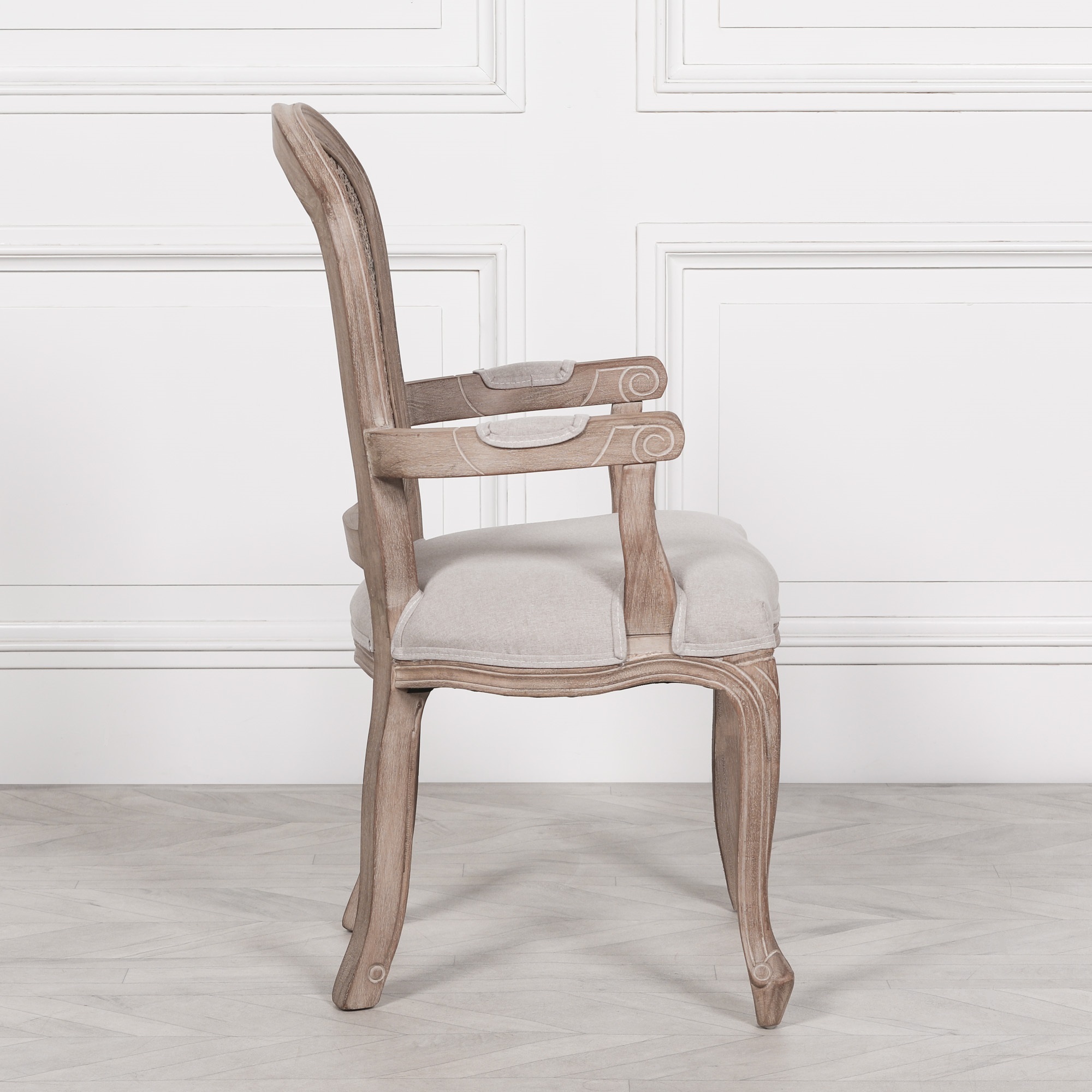 Wooden Louis carver dining arm chair in wooden finish with light washing added to the detail of the frame. Finished with a linen upholstered seat top.