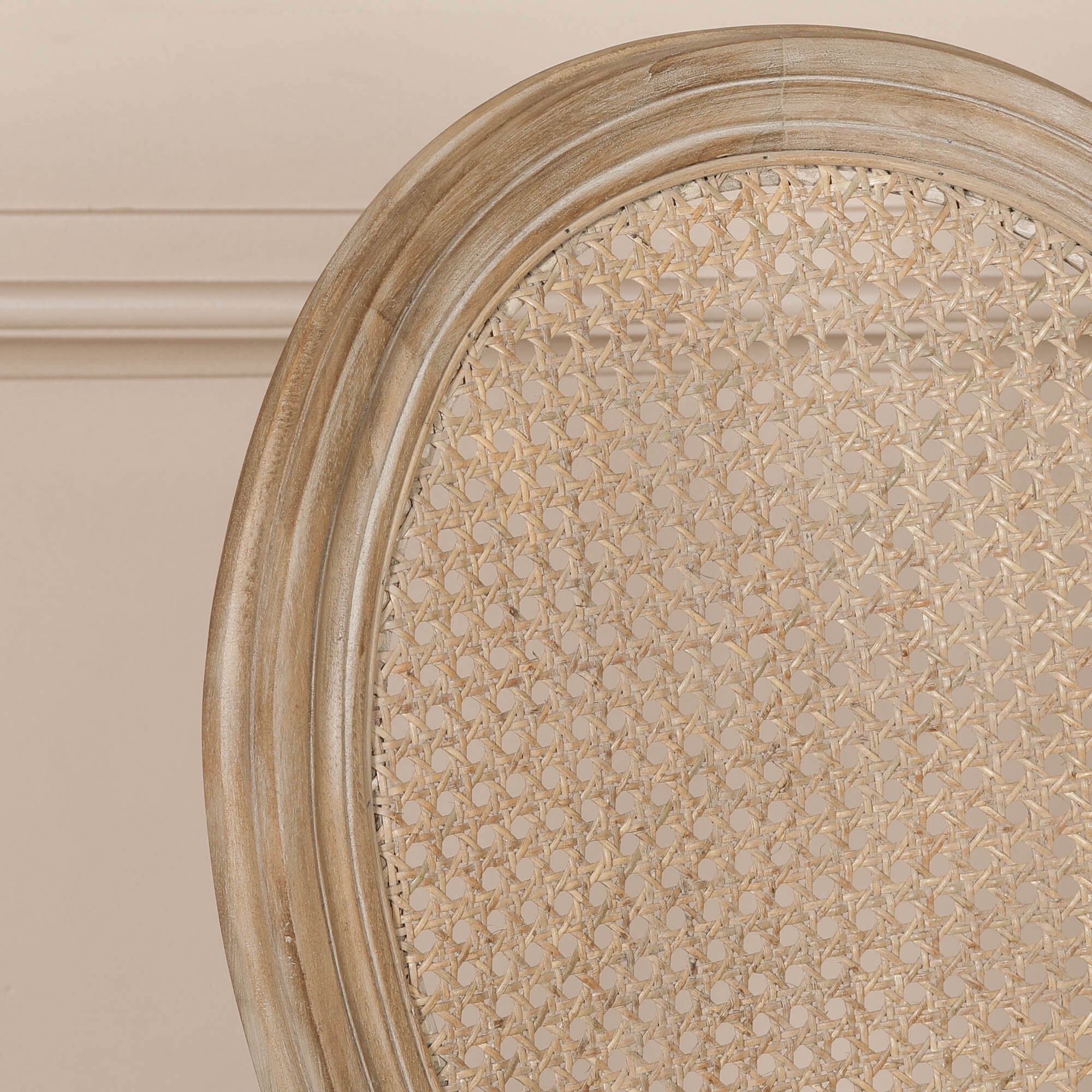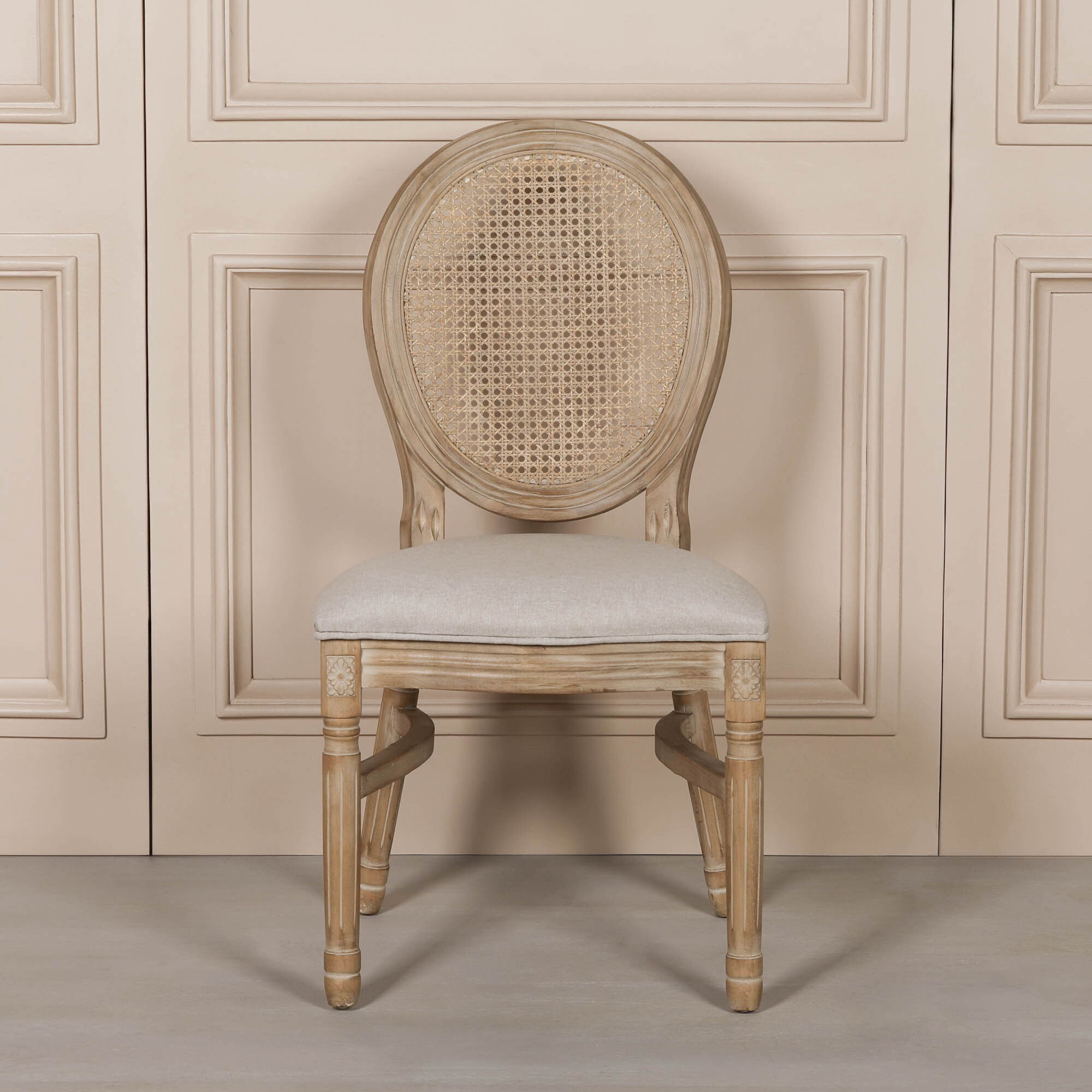 Wooden Louis dining chair in wooden finish with light washing added to the detail of the frame. Finished with a linen upholstered seat top. Dining chair is stackable.