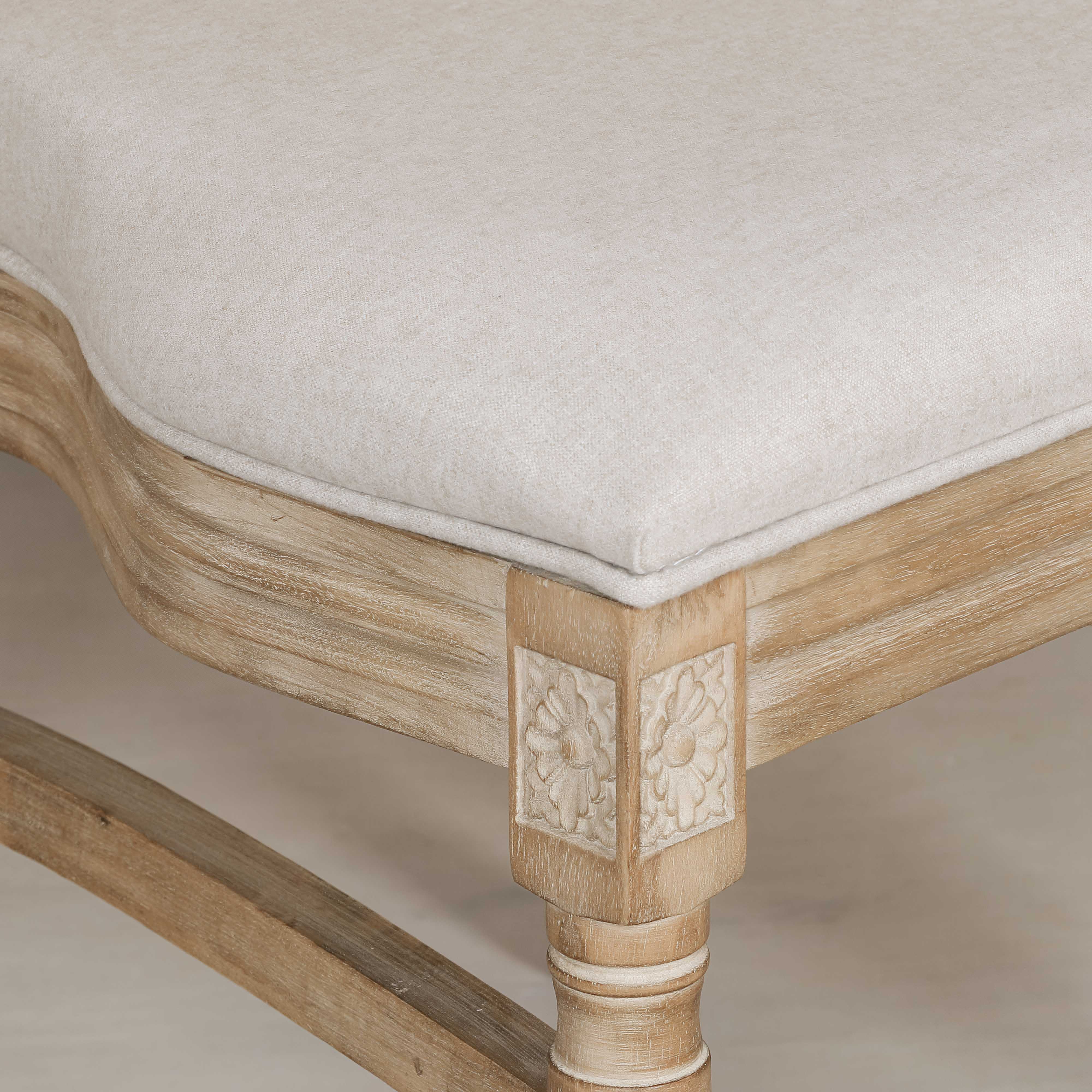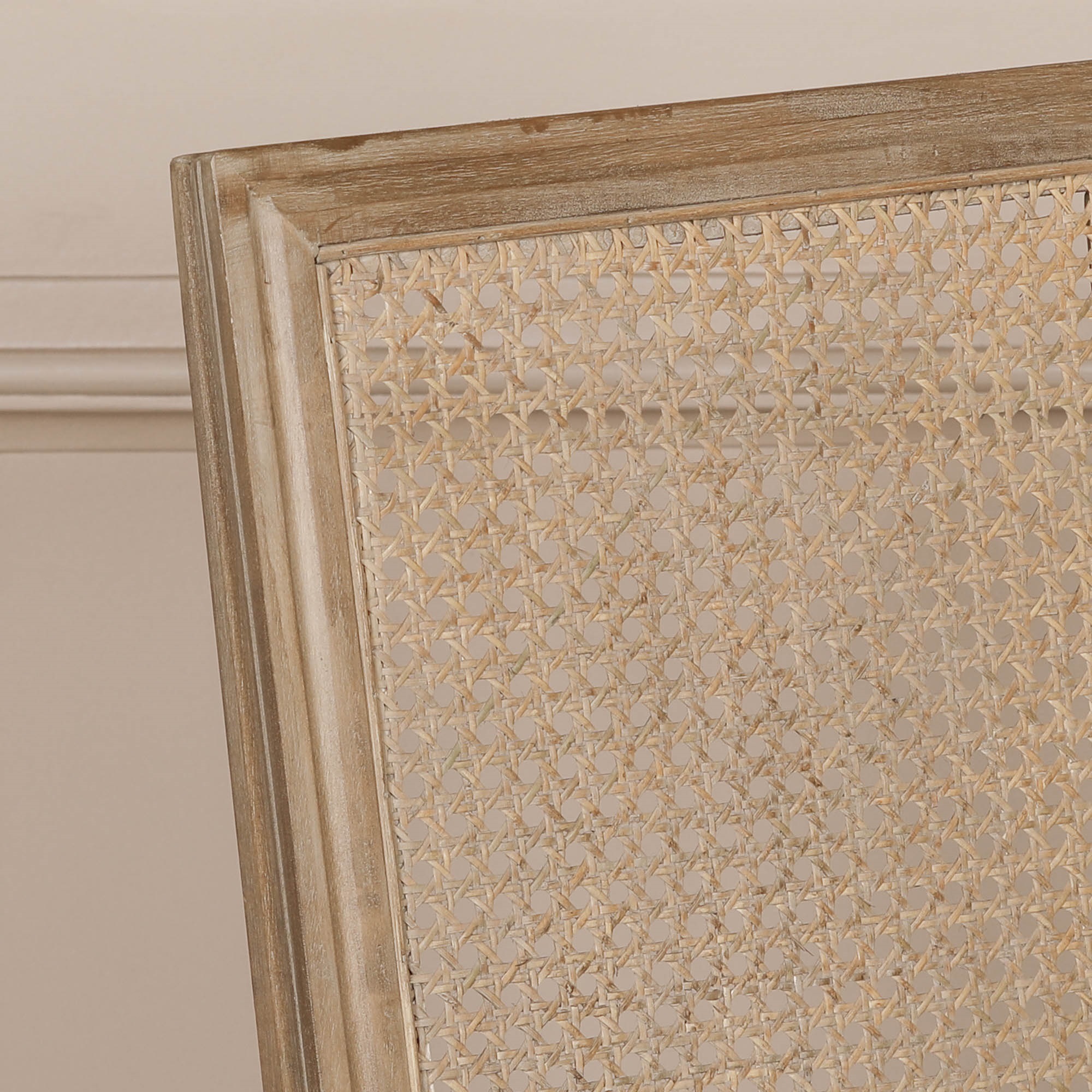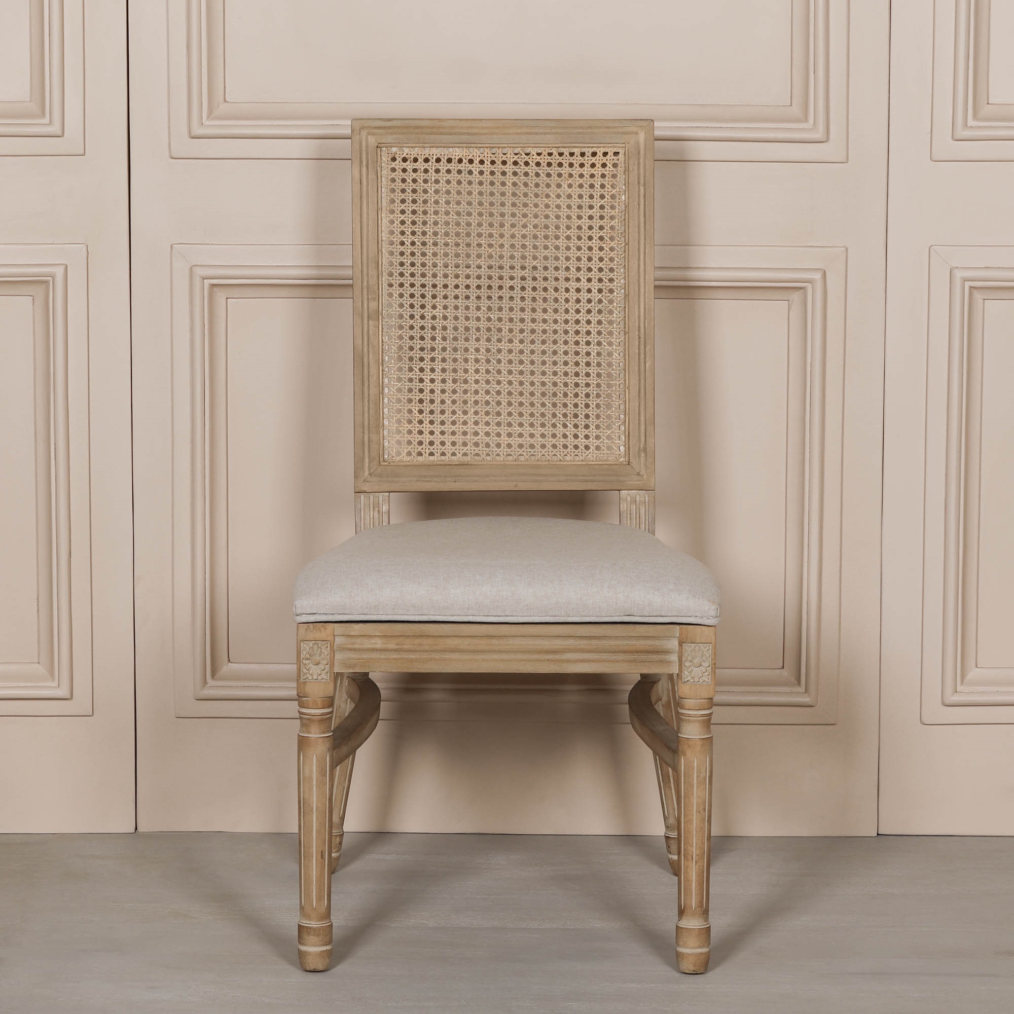 Wooden Louis dining chair in wooden finish with wood washing added to the detail of the frame. The back rest is a square shaped back finished in rattan. The seat pad is linen upholstered. Dining chair is stackable.