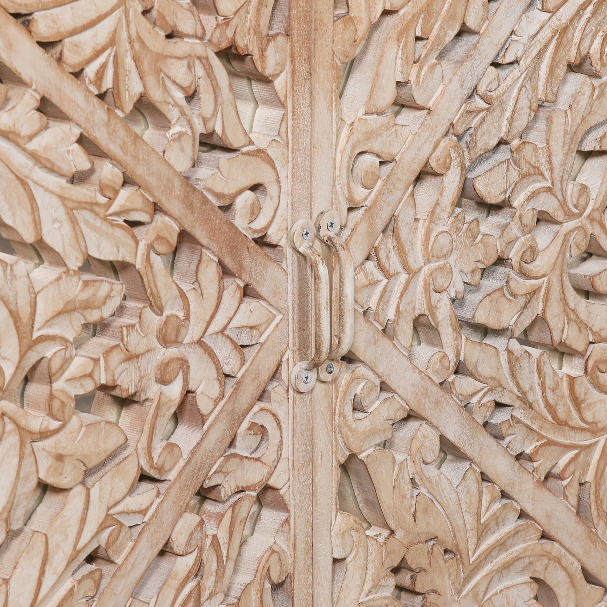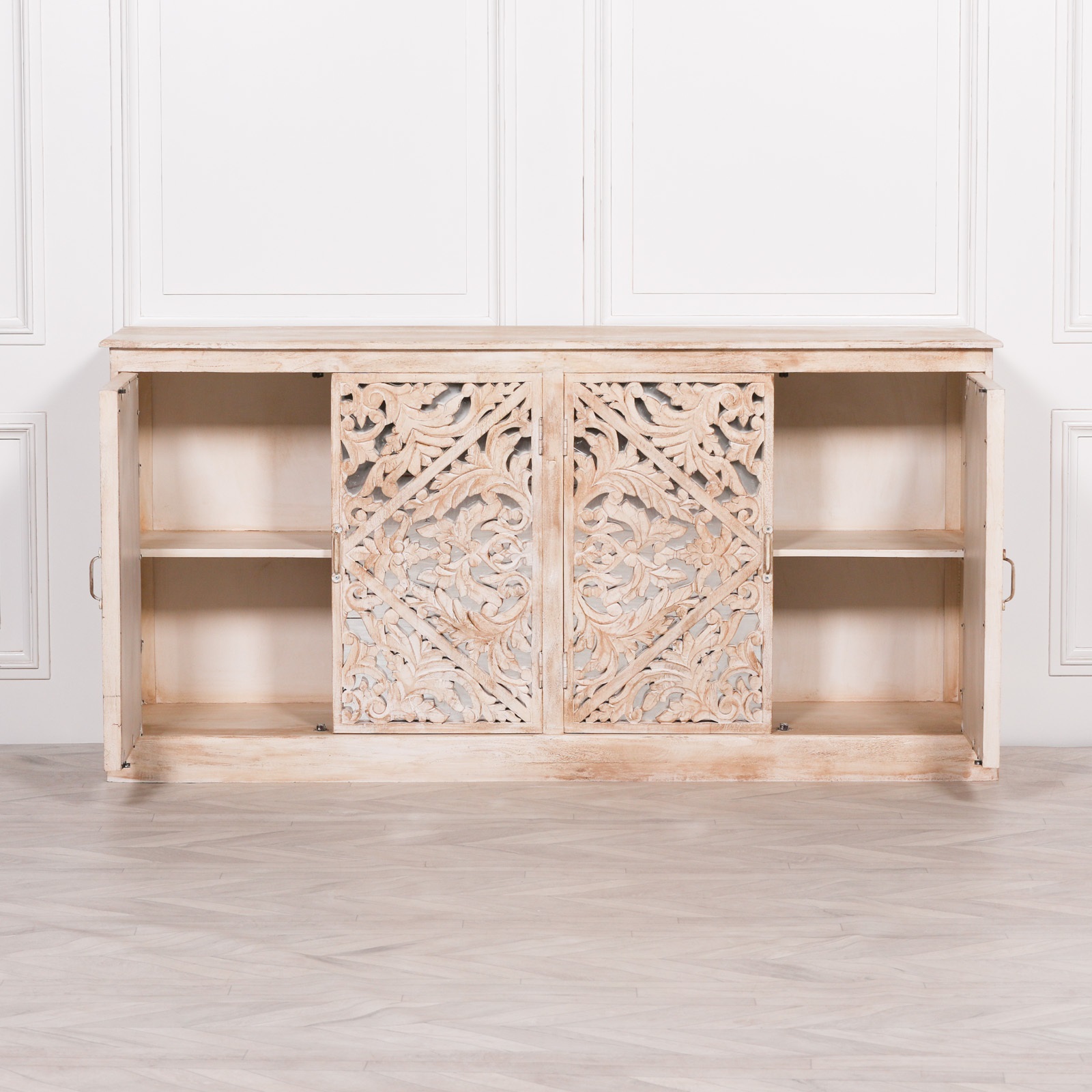 Wooden sideboard hand-crafted from mango wood in a light rustic finish with ornate hand-carved mirrored backed doors.
