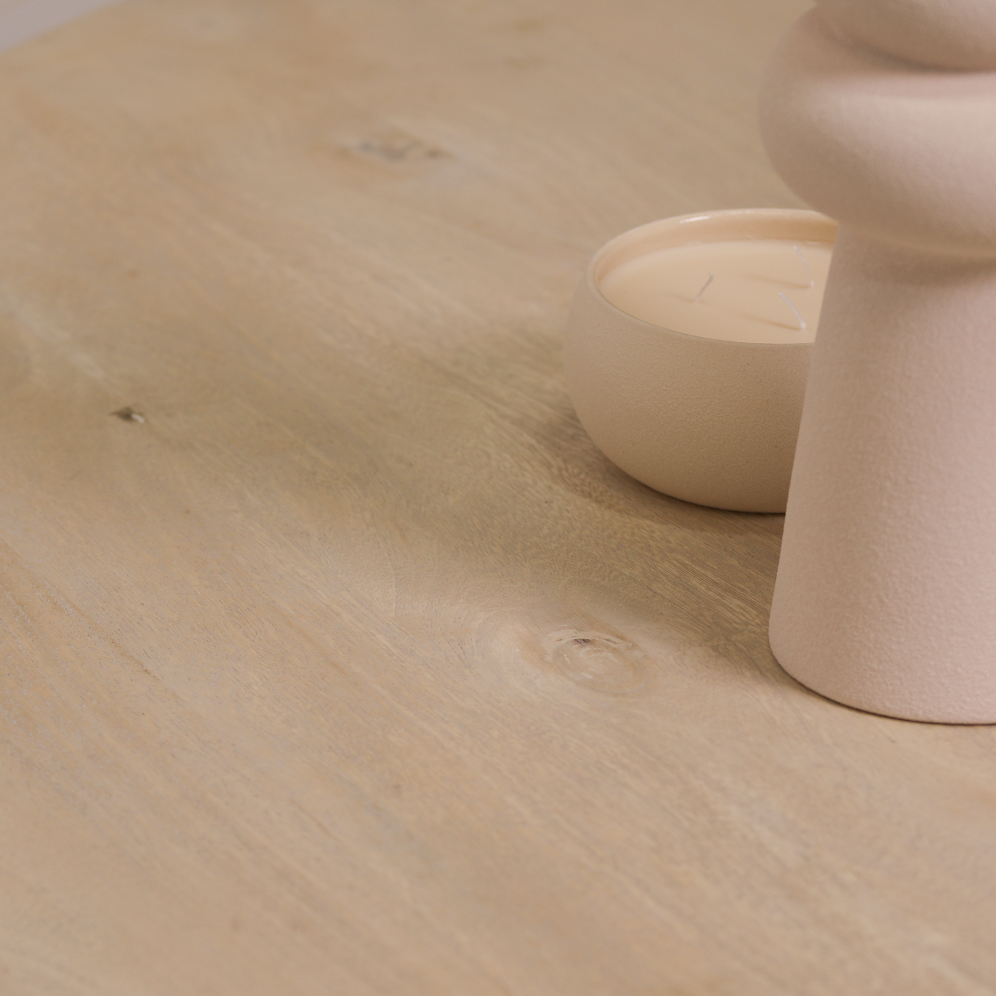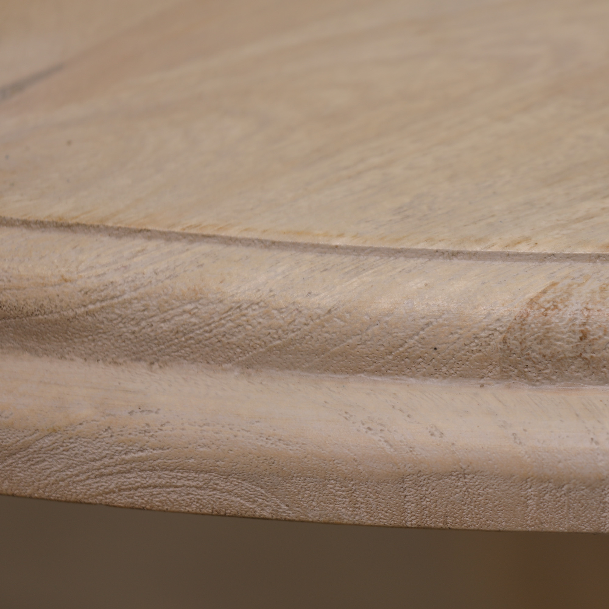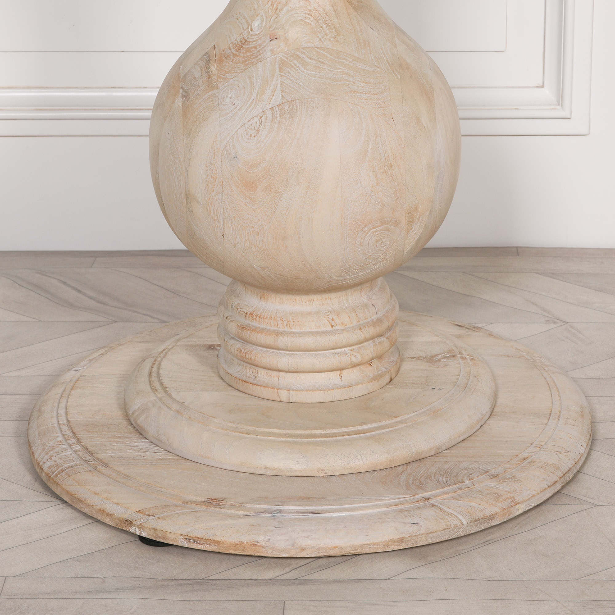 Round 152cm dining table handcrafted from mango in a blanche wood finish with subtle pale grey wash over the wood. The table has a rounded hand-carved detailed columned base.