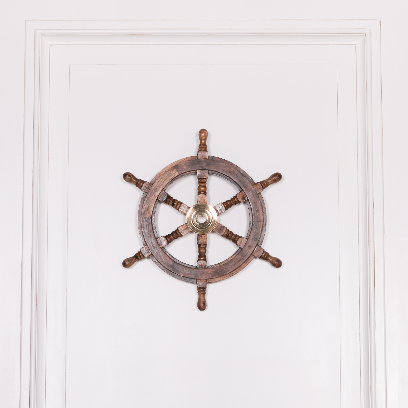 Wooden ships wheel wall decoration handcrafted from mango wood and brass in a rustic vintage style.